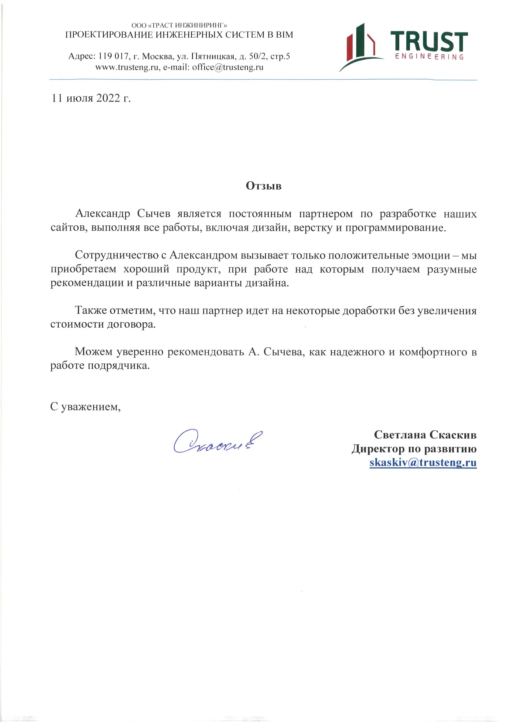 В настоящее время наша студия с компанией ООО «Траст Инжиниринг» находится в теплых партнерских отношениях. Продолжаем сотрудничество на постоянной основе. В данный проект внедряются новые улучшения и функционал. Было реализовано еще несколько интересных проектов.